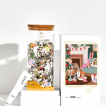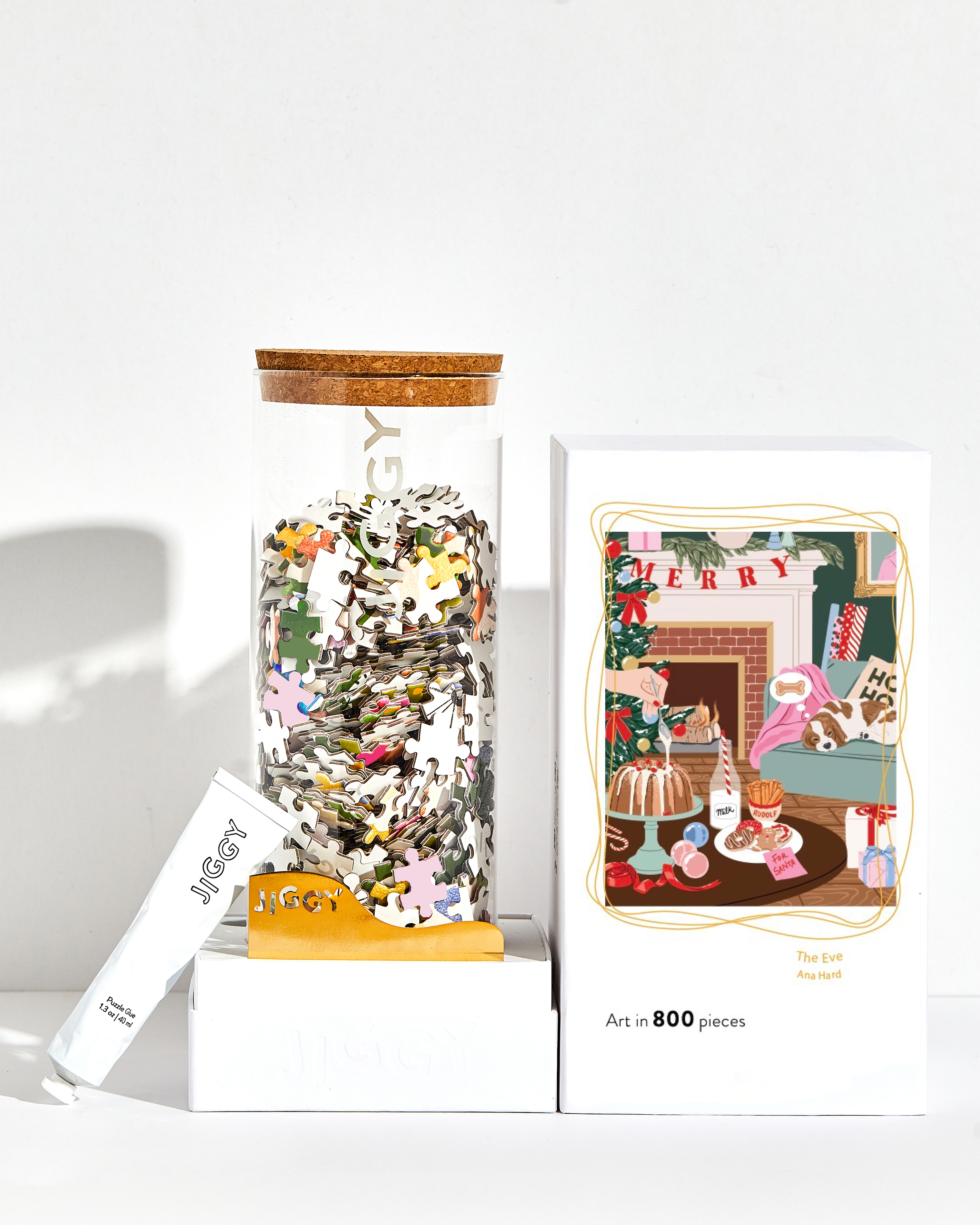 Each JIGGY Classic puzzle comes in a reusable glass jar and includes a tube of puzzle glue, a straight-edge tool to spread the glue and a print of the art to follow.