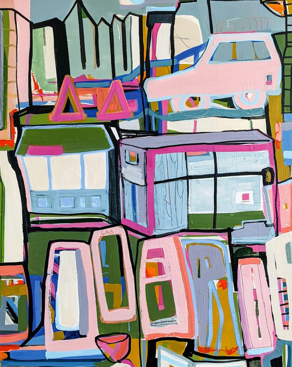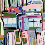 and movement. Raw compositions painted with considered color palettes demonstrate a marriage of her backgrounds in intuitive creativity and interior design.