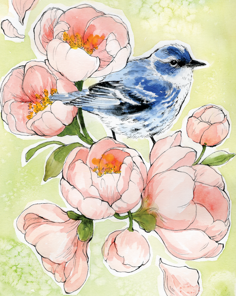 My name is Caverly and I’m a Canadian wife and mother of three, with a degree in fine art and illustration, who loves to draw and paint florals, birds, landscapes, and faces. I started my artistic journey, like most artists do, as a Disney-dreaming child. I can remember getting into trouble for drawing on the underside of my grandmother’s table cloth because I didn’t have any paper within arms reach. I left my vandalizing ways behind me and nowadays stick to more traditional media, like paper and canvas, watercolours, oils and inks.