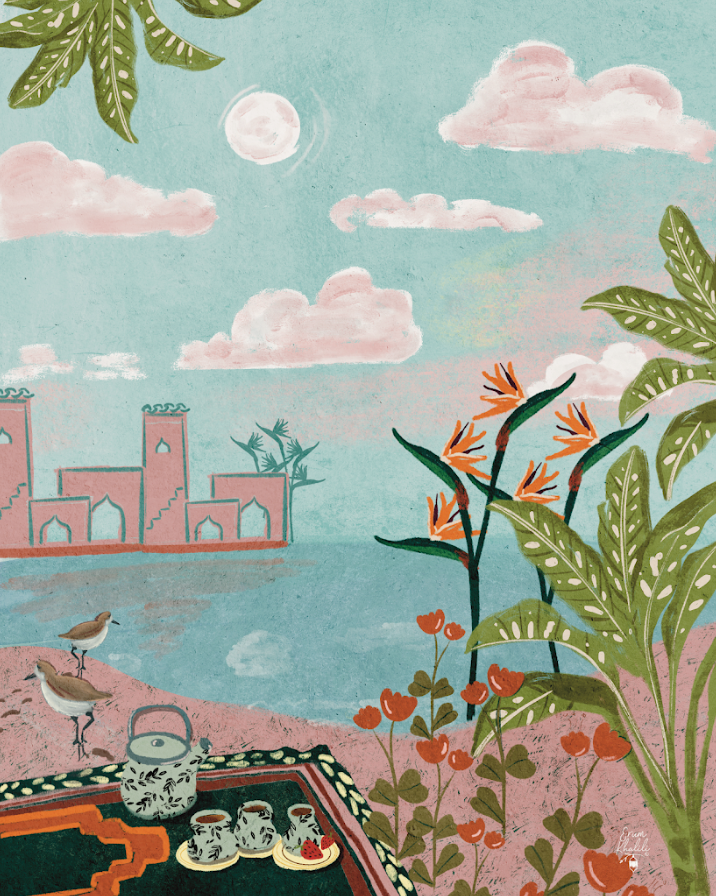 Erum Khalili is an artist and illustrator based in California. She’s inspired by the beauties of nature, her travels, and islamic architecture. Her paintings are dream-like reflections of her inner world. Art helps to center her by focusing on what’s most important. Her mixed media pieces incorporate digital painting, gouache, ink and watercolor with limited color palettes and bold textures.