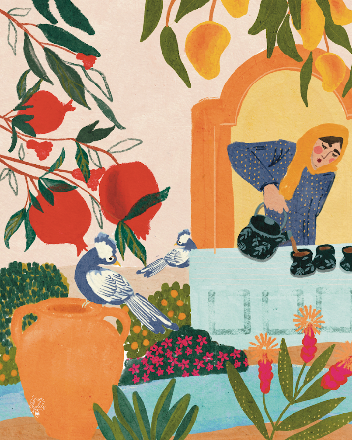 Erum Khalili is an artist and illustrator based in California. She’s inspired by the beauties of nature, her travels, and islamic architecture. Her paintings are dream-like reflections of her inner world. Art helps to center her by focusing on what’s most important. Her mixed media pieces incorporate digital painting, gouache, ink and watercolor with limited color palettes and bold textures.