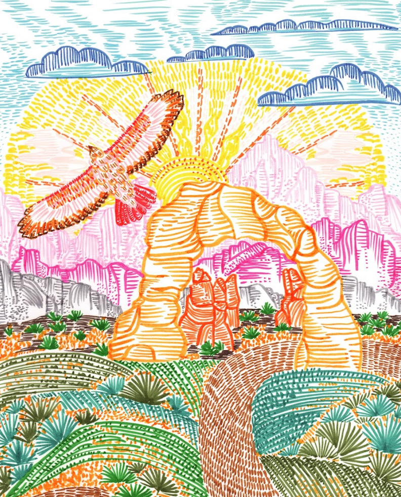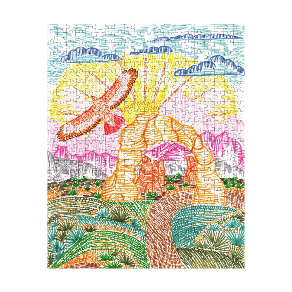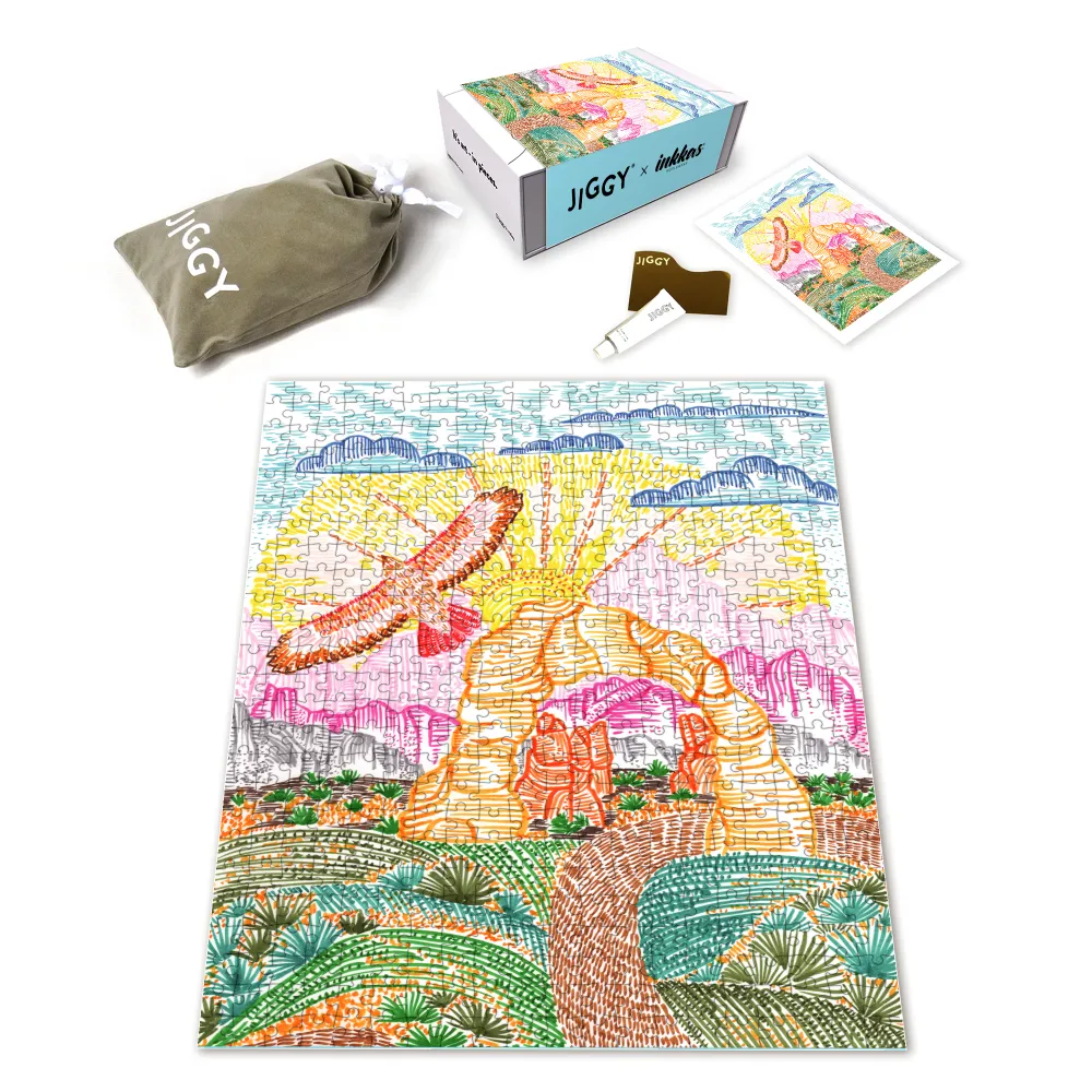 Inkkas is a nature-inspired, independent footwear brand where every design begins as a hand-inked work of art. This Jiggy puzzle pairs with the artful and ultra-comfy Jasper shoes—a tribute to the wild beauty of the American Southwest. Inspired by Utah’s Arches National Park, the design captures the region’s iconic red rock formations and sweeping desert vistas, evoking the magic of sandstone arches and canyons glowing beneath a fiery sunset sky.
