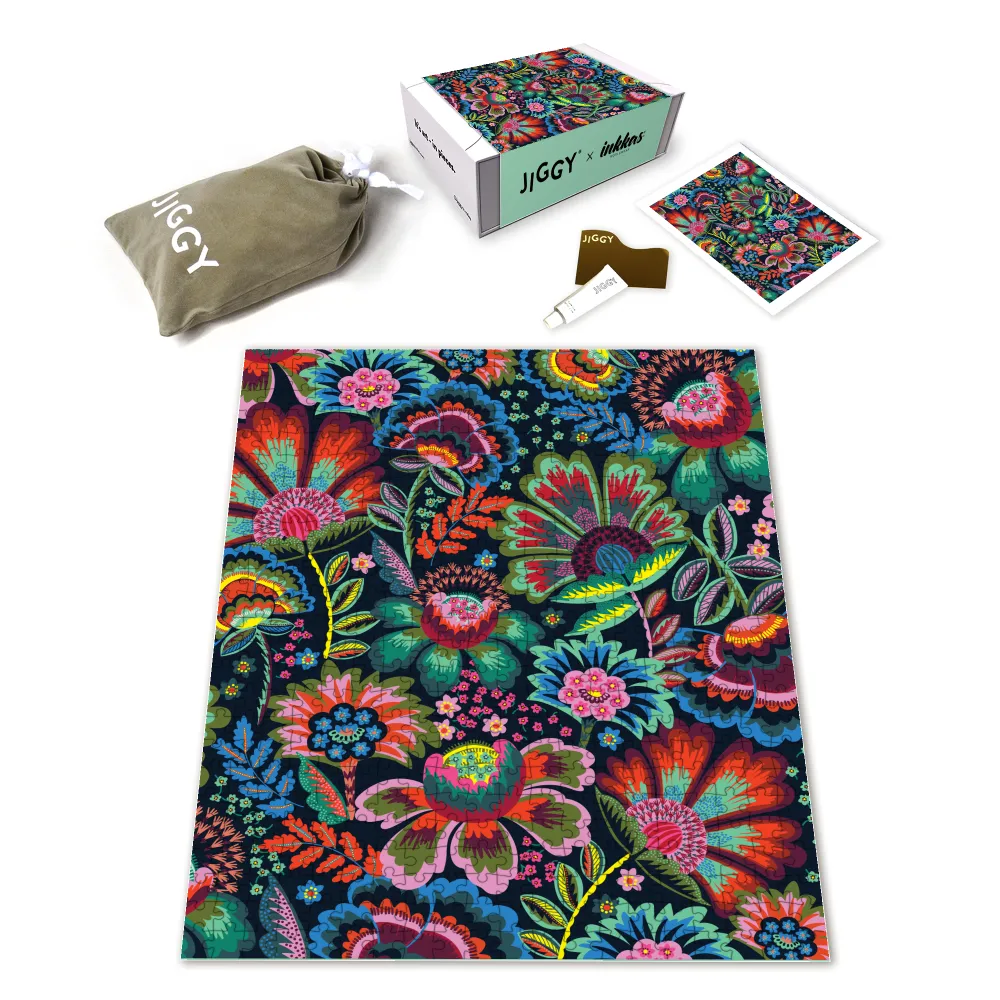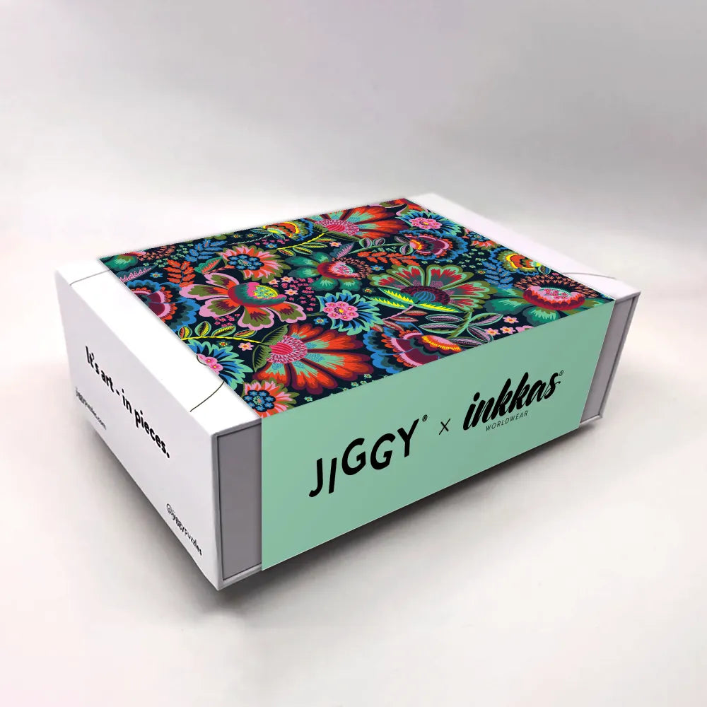 Inkkas is a nature-inspired, independent footwear brand where every design begins as a hand-inked work of art. This Jiggy puzzle pairs with the artful and ultra-comfy Saras shoes—inspired by traditional Sarasa textiles. The hand-drawn design blends delicate Japanese floral motifs with bold, contemporary color. Light blue and pink blossoms wind gracefully through flowing vines, creating a timeless pattern rooted in nature and artistry.