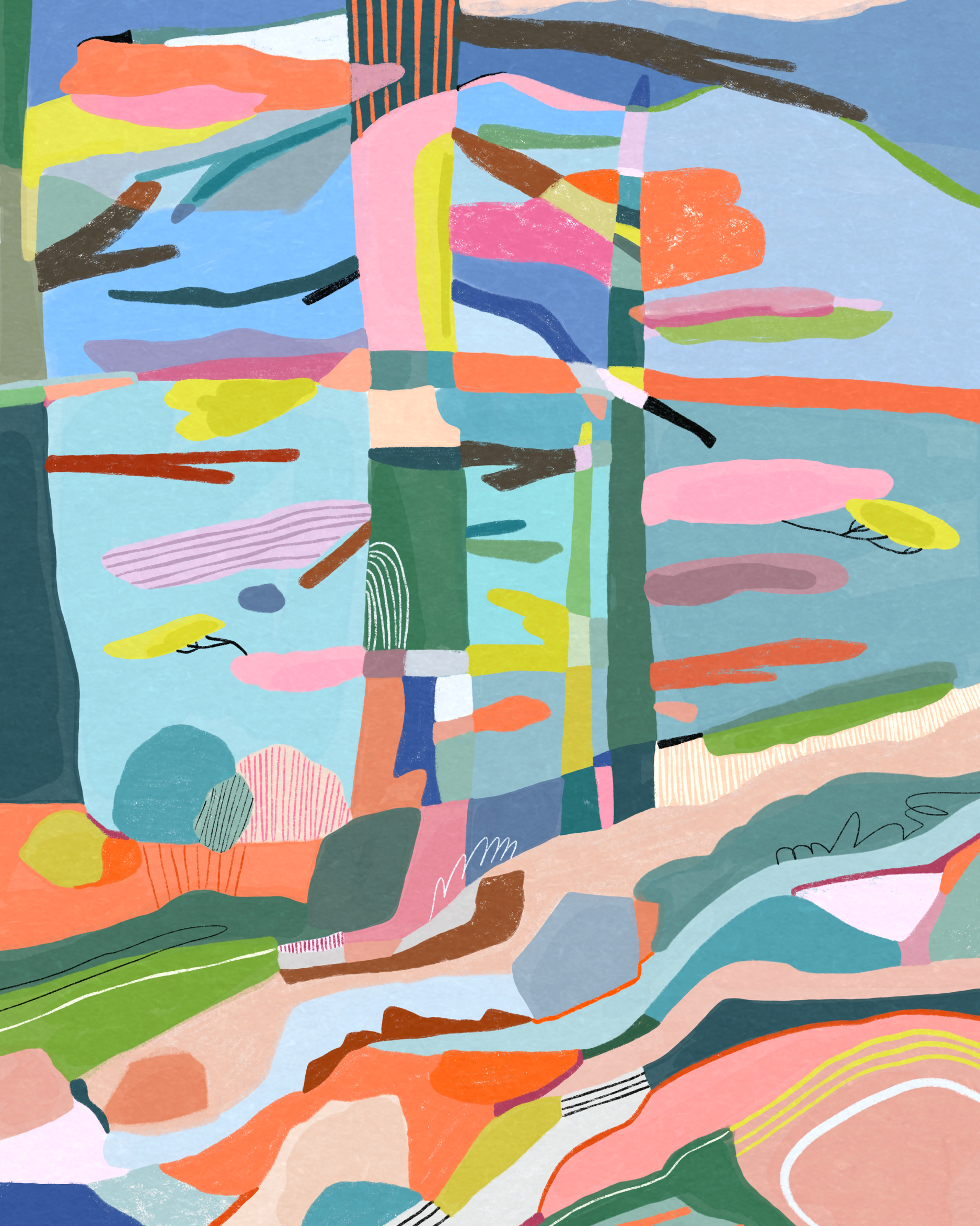 The Italian artist Marina Ester Castaldo has created a universe made of imaginary and secret sceneries. Combining bold and saturated colours and intuitive shapes, her vibrant work reflects the contrasts and energy of southern Italy, aiming to capture raw emotions and everyday beauty.
