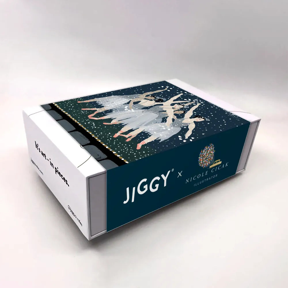 Each JIGGY Classic puzzle comes in a reusable glass jar and includes a tube of puzzle glue, a straight-edge tool to spread the glue and a print of the art to follow.