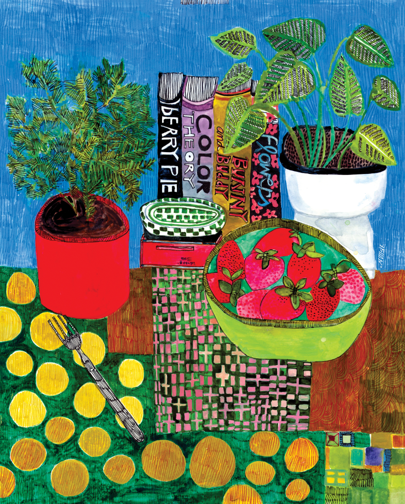 Sharon Nullmeyer is a painter living and working in Southern California. She finds inspiration all around her, and paints every day. Her paintings are full of color and detailed pattern and highlight her love of flowers, antiques and nature. She is obsessed with her sketchbooks, her paints and her dog Izzy. Nullsie would like her paintings to bring a smile to your face.