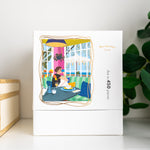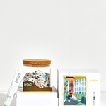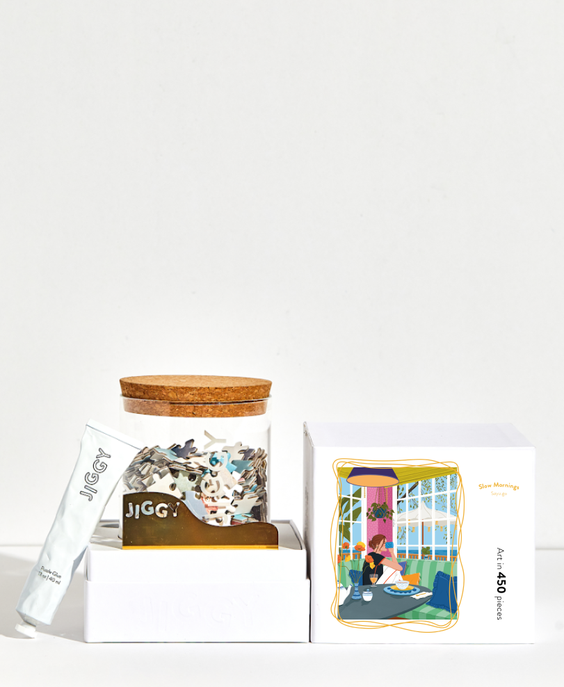 Each JIGGY Classic puzzle comes in a reusable glass jar and includes a tube of puzzle glue, a straight-edge tool to spread the glue and a print of the art to follow.